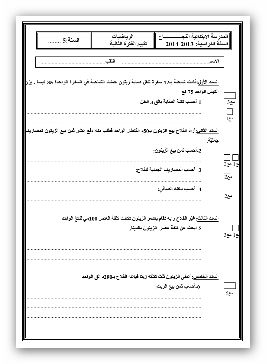 تقييم الفترة الثانية في الرياضيات للسنة الخامسة ابتدائي امتحانات تونس