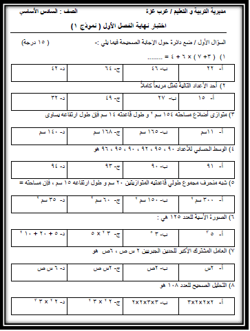 امتحانات الرياضيات للصف السادس الابتدائى الفصل الدراسى الأول