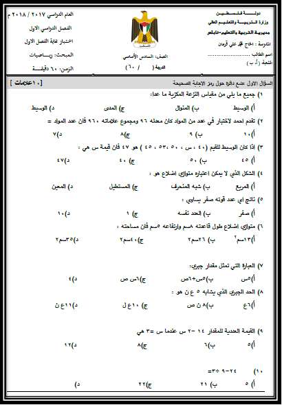 اختبار نهاية الفصل الأول في الرياضيات للصف السادس المكتبة الفلسطينية الشاملة
