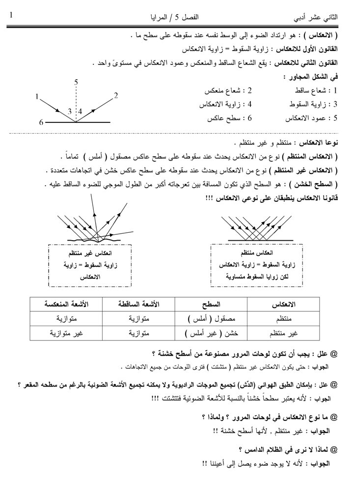 الفيزياء ملخص الإنعكاس والمرايا للصف العاشر عام ملفاتي