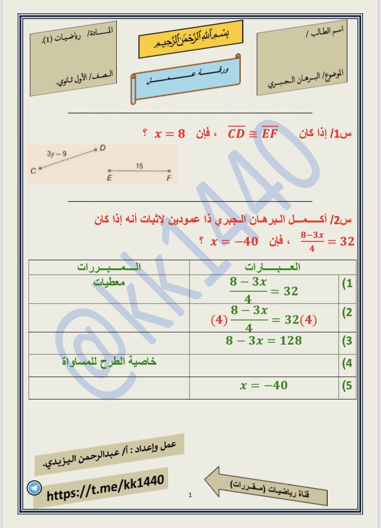 معلم رياضيات مقررات On Twitter مقرر رياضيات1 الصف الاول ثانوي عنوان الدرس البرهان الجبري المحتوى ورقة عمل مسائل مناهج الرياضيات الرياضيات للجميع Https T Co Lpzzoafehc
