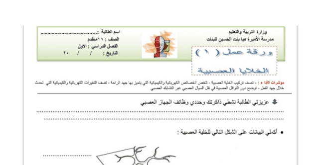 أوراق عمل الجهاز العصبي في الاحياء للصف العاشر العام الفصل الثالث سيو ايفو