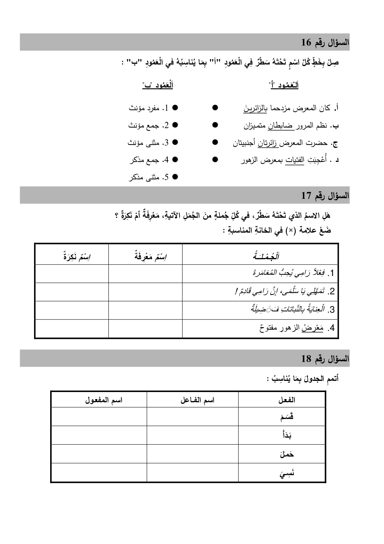 تمارين في اللغة العربية المستوى الخامس ابتدائي